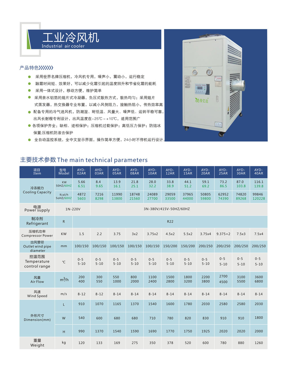 ●采用亲水铝箔的翅片式冷凝器,负压式散热方式,散热均匀;采用翅片式蒸发器,热交换器专业布置,以减小风侧阻力,接触热阻小,传热效率高配备专用的冷气送风机,防潮湿、耐低温、风量大、噪声低、运转平稳可靠,出风长,出风温度在- 25C ~+ 10°C,适用范围广